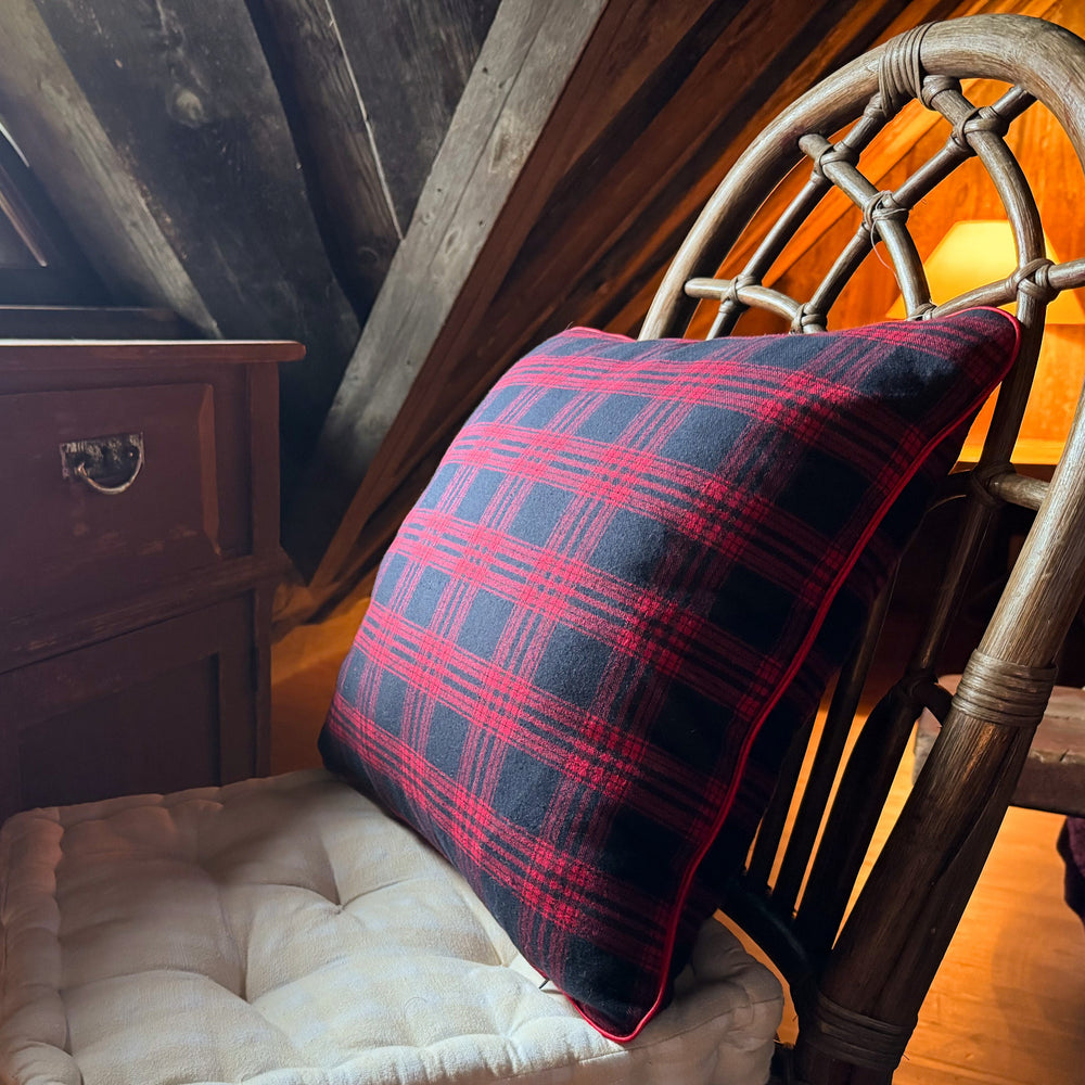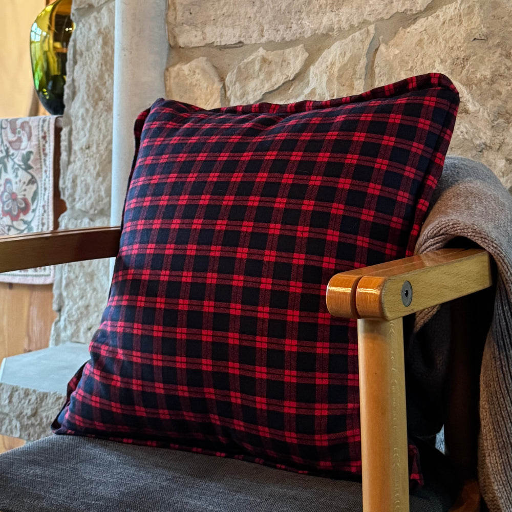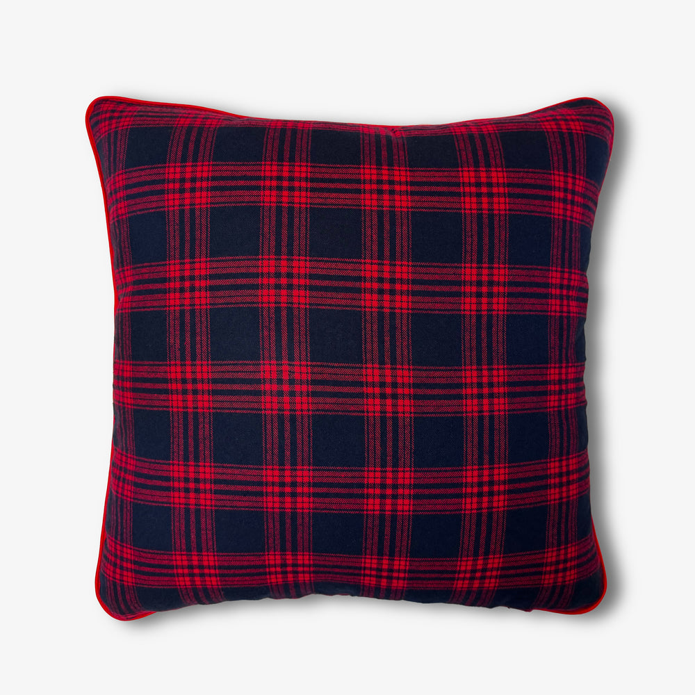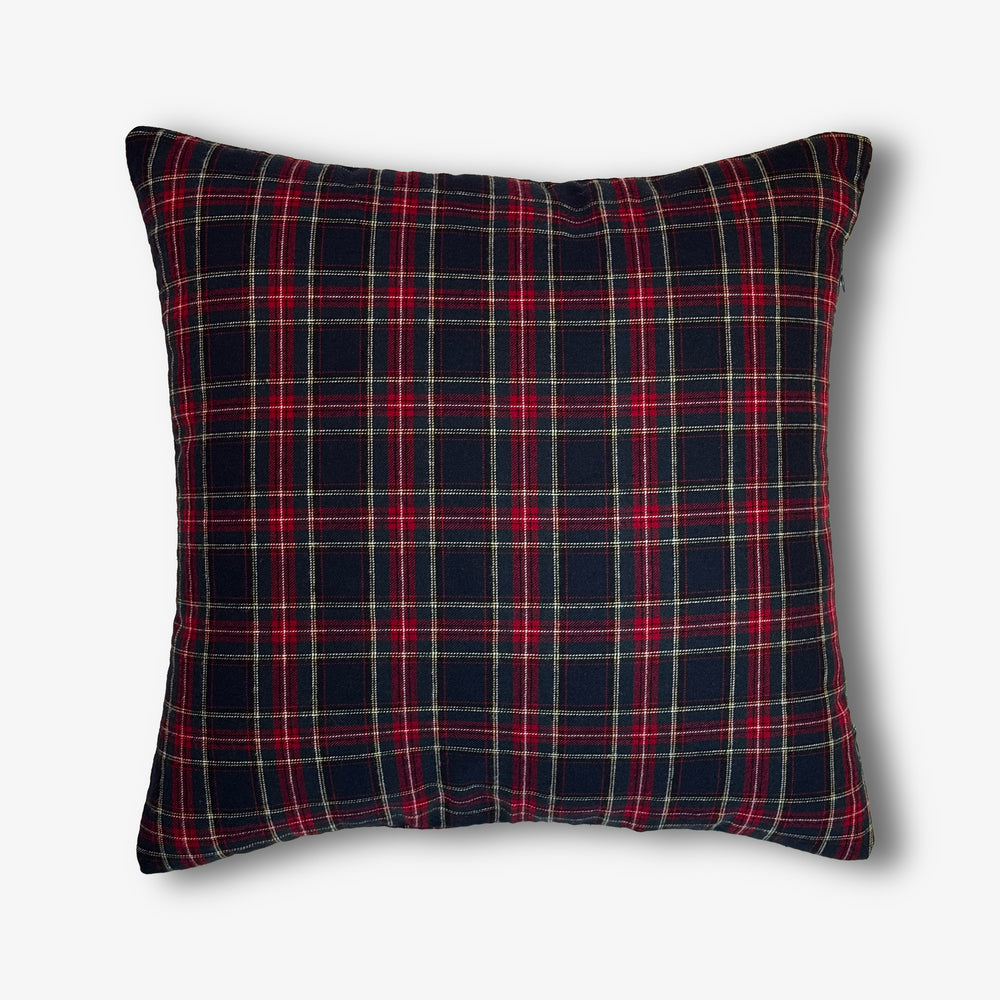 A peaceful peninsula on our island home, this cushion brings timeless manor house elegance with its deep navy and red plaid.